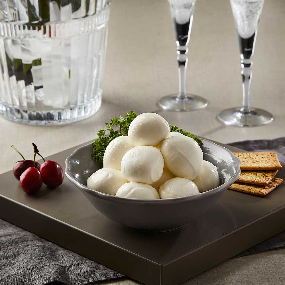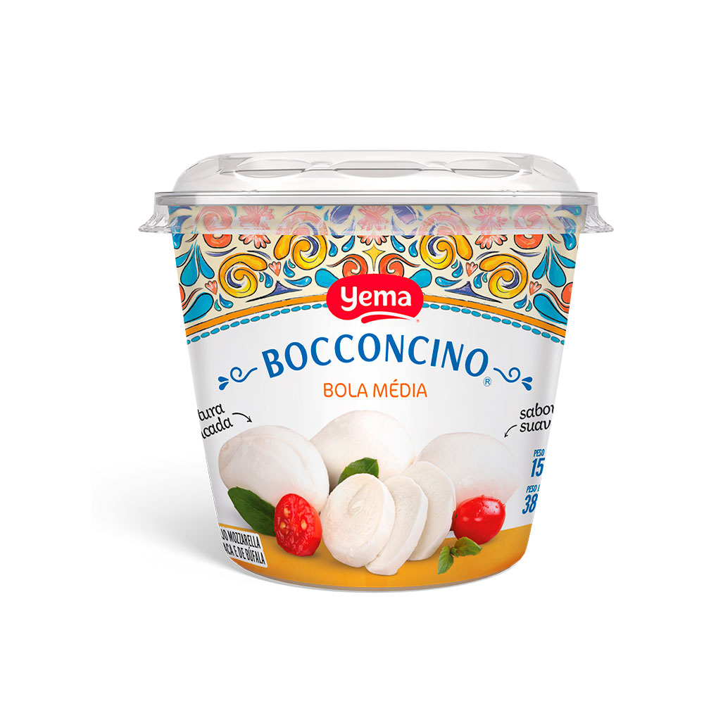 Produto exclusivo Yema, bolas de tamanho médio, elaborado a partir de uma cuidadosa e balanceada combinação do leite de búfala e leite bovino, textura macia com maior umidade, possui sabor suave, fonte de cálcio e proteína
